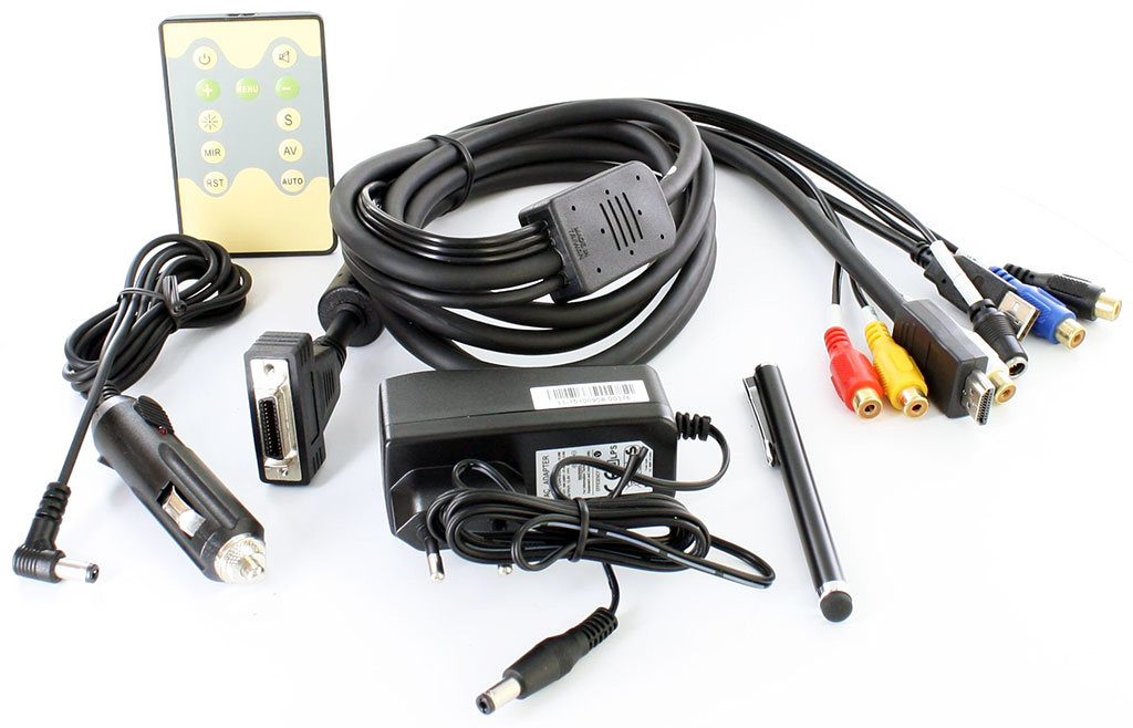 AC-Adapter for home usage and a car cigarette lighter adapter is included as well as the IR-remote-control unit and the extra long (2,5 meters) All-In-One connector cable.